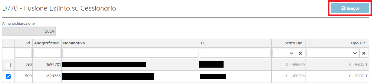 N.B. Per eseguire questa operazione, è necessario aver precedentemente creato 770 per ciascun dichiarante selezionato (se non è stato fatto la colona DichId contiene il valore -1).