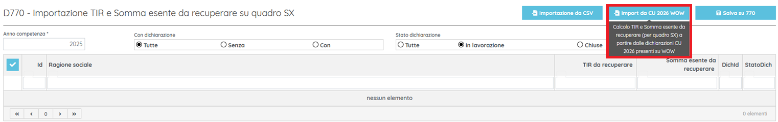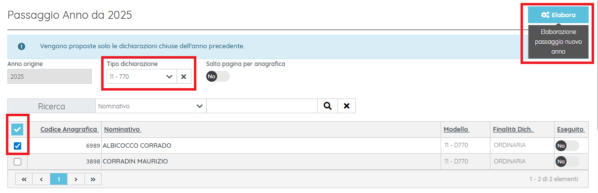 NB I dichiaranti con dichiarazione chiusa nel 2025 per i quali non è ancora stato effettuato il passaggio non verranno proposti finché il passaggio non è stato fatto, nemmeno con scelta "Tutte (escluse anomalie)" su opzione "Dati passaggio" poiché la situazione è considerata una anomalia