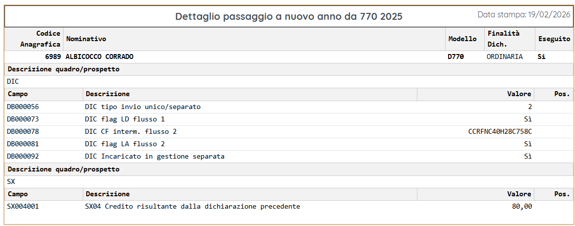 Al termine dell'elaborazione verrà fornito un tabulato di controllo con il riepilogo dei dati trasferiti tramite il passaggio d'anno che sono alcune informazioni del frontespizio e i riporti del Quadro SX.