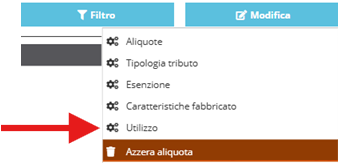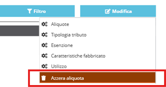Nel caso in cui, per un motivo x, si volessero azzerare le aliquote massivamente, impostare tutti i filtri desiderati e selezionare gli immobili interessati. Premere "Modifica" in alto a destra e scegliere: