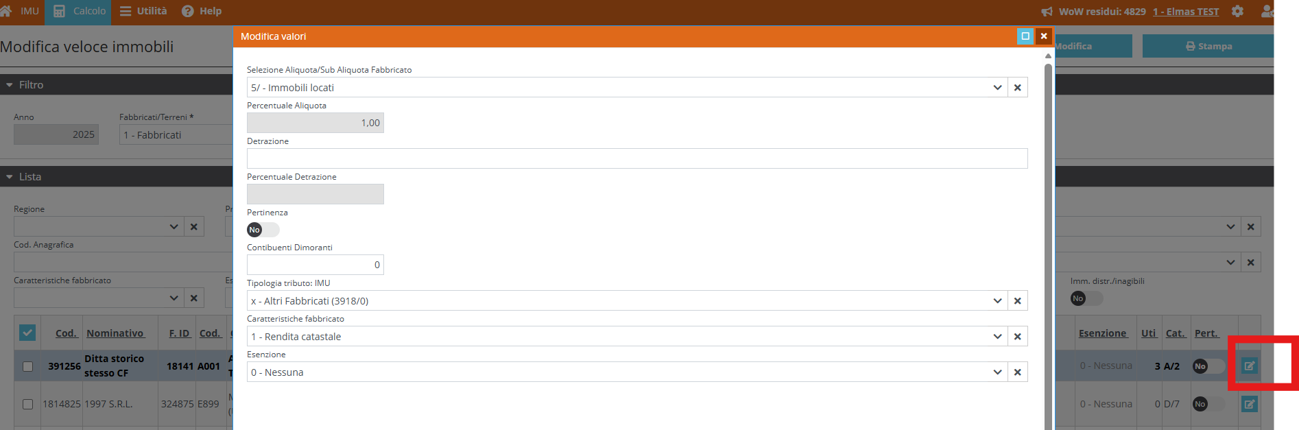 Se si vuole modificare singolarmente un immobile, basta premere il pulsante "Modifica" sulla riga corrispondente: