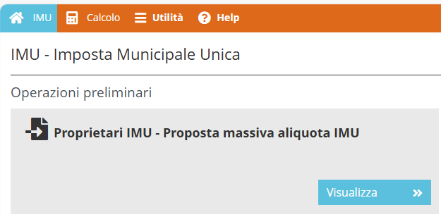 Si verrà ricondotti alla pagina iniziale del modulo IMU. La pagina è suddivisa in 3 gruppi di funzionalità: